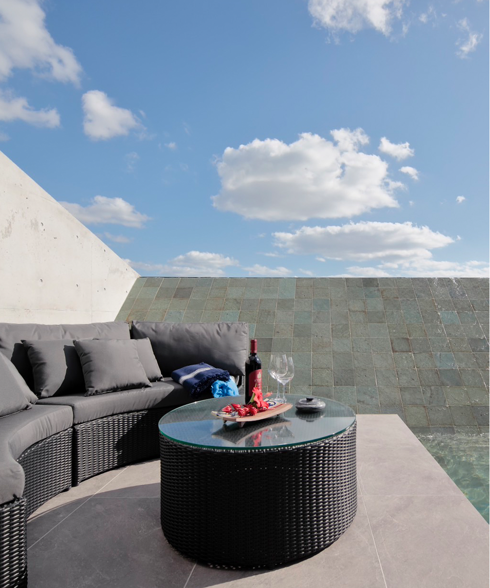 Open the door, walk into the villa, and sit down on the sofa. The experience