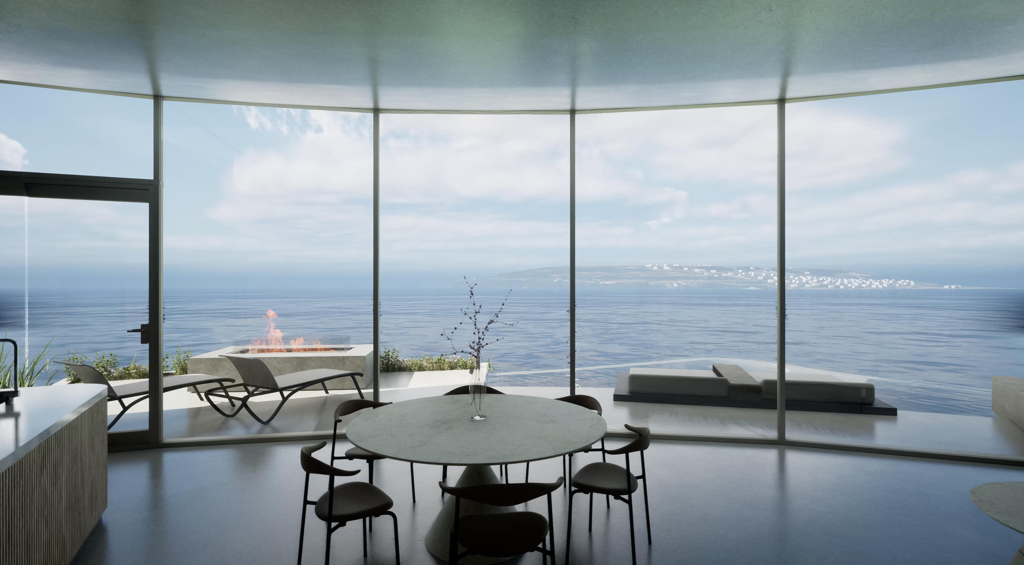The ceiling reflects the colors of the sky and water, providing the interior with a wide range of expressions.