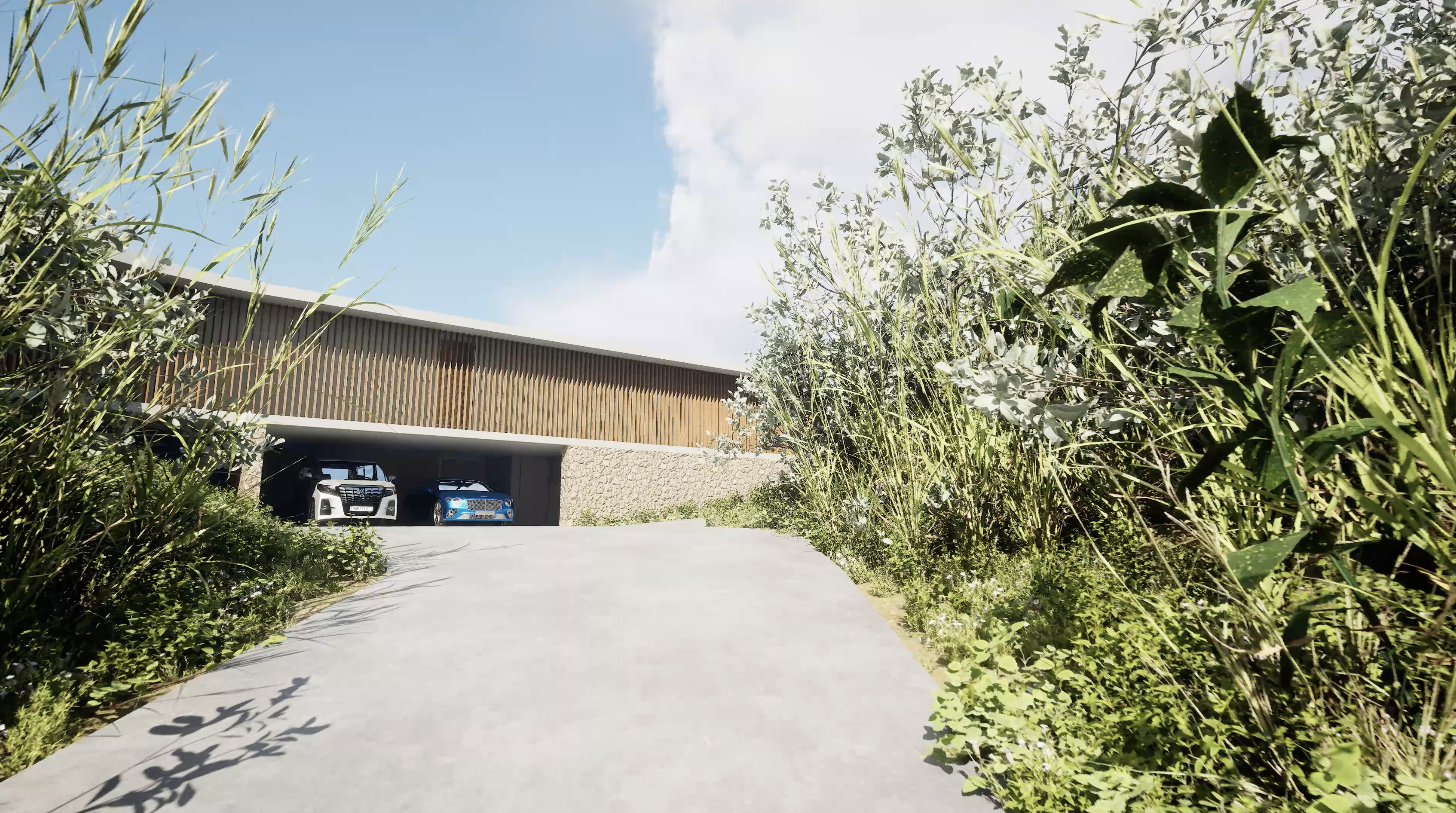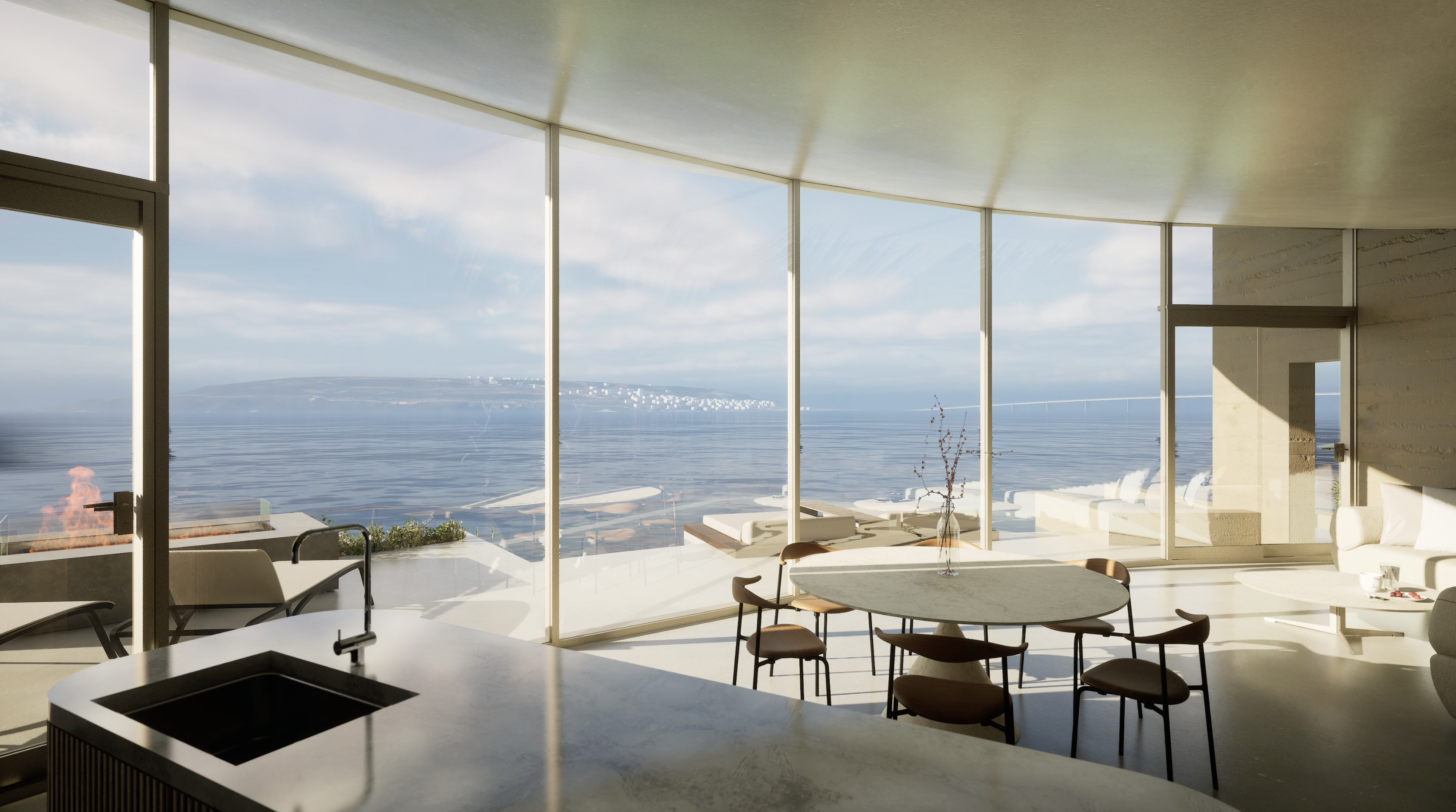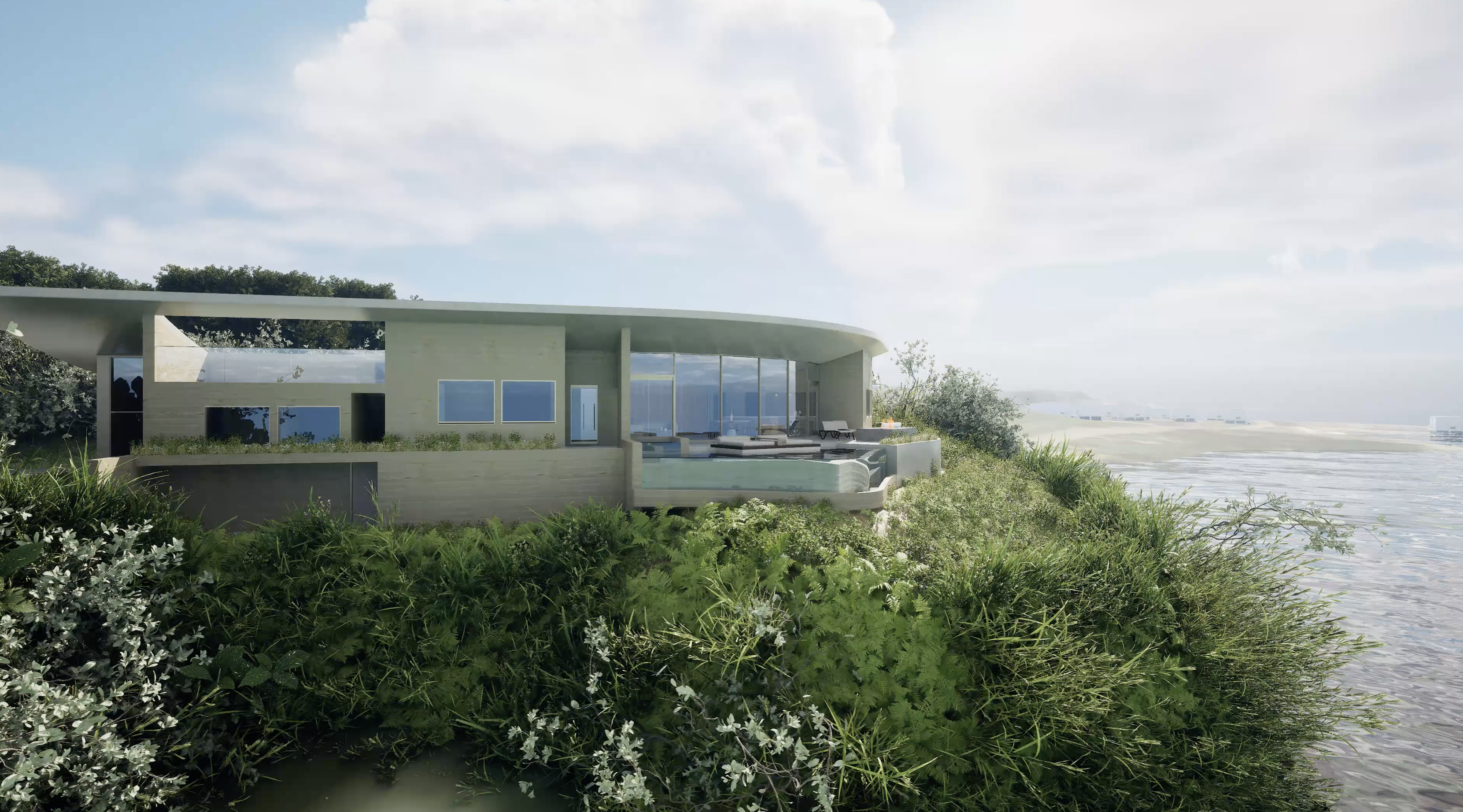 A building design that blends straight lines and curves, with emphasis on the cliff’s flat area.