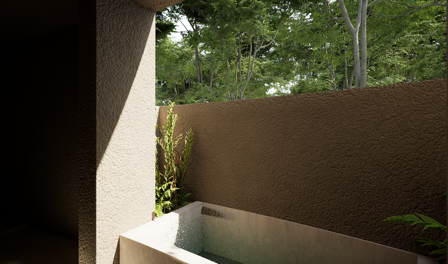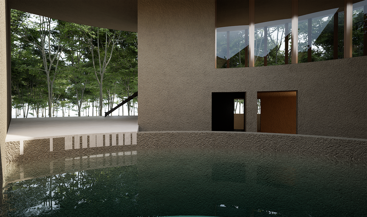 The fan-shaped building is surrounded by Fukugi trees outside and features an open-air pool inside, creating an atmosphere where you can constantly sense the presence of both the Fukugi and the sky. When privacy is desired, the sound of wind rustling through branches and leaves, and rain tapping against the walls, offers a peaceful background. This space is designed to engage and stimulate all five senses in ways unique to its location.
