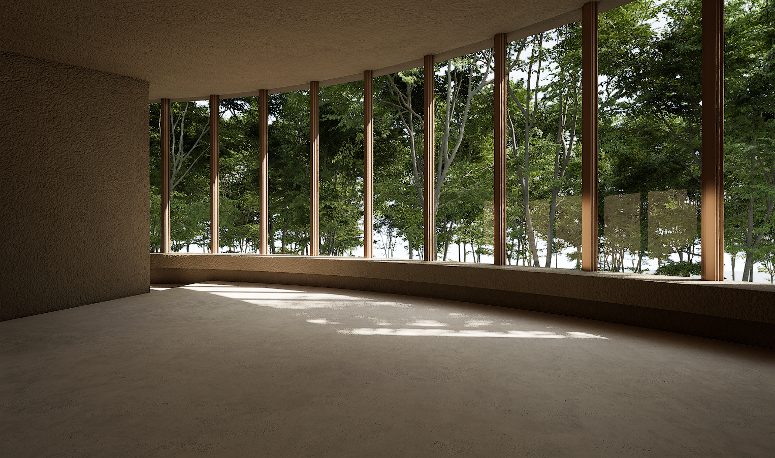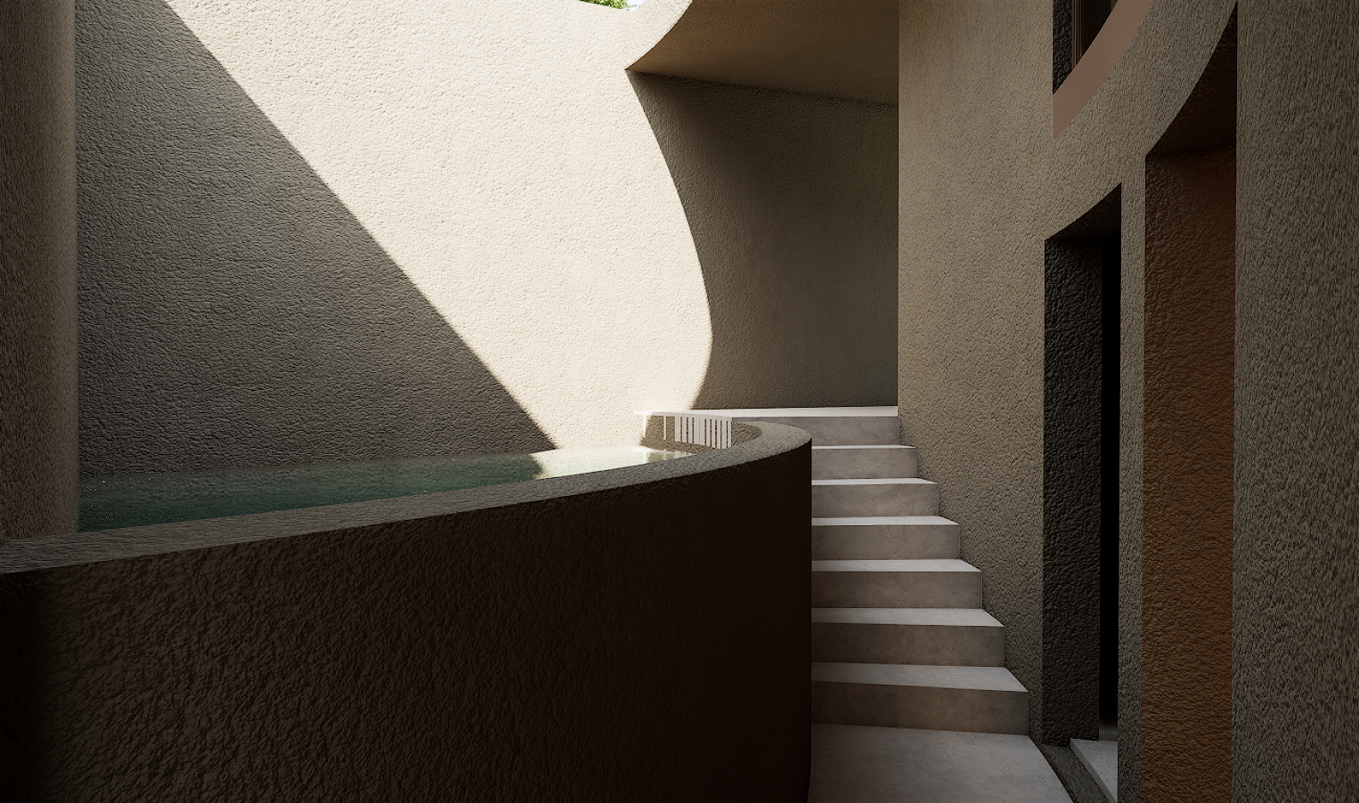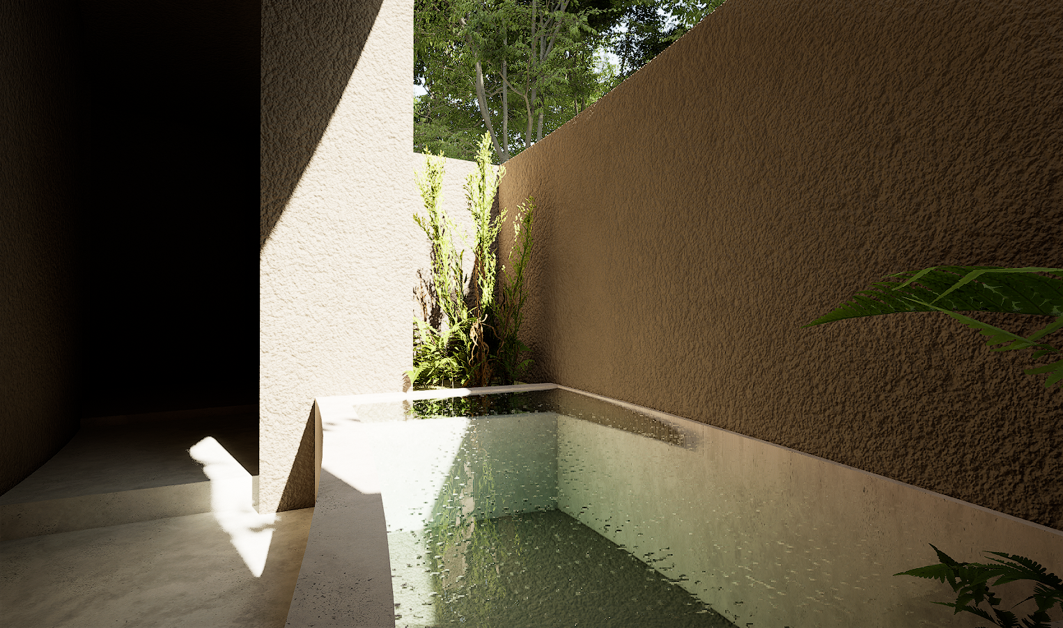 扇形の建物の外側にはフクギ、内側には空に抜けるプールを配置し、どこにいてもフクギと空のAOが感じられ、プライバシーに配慮しつつ、枝葉が風で靡く音や雨音が壁で反響して、ここでしか感じられない五感を刺激する空間となっております。
