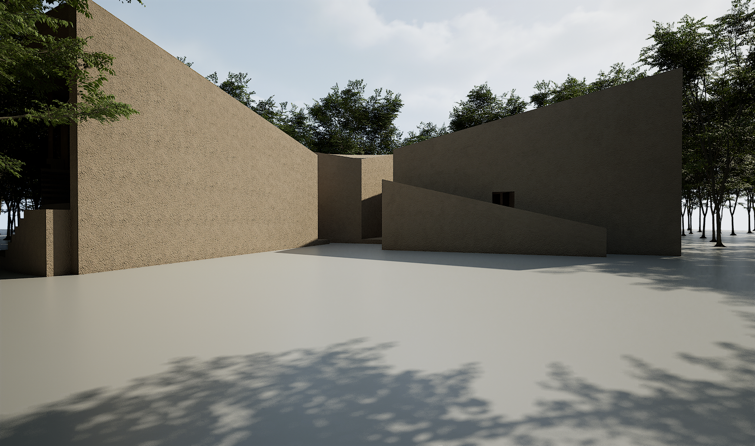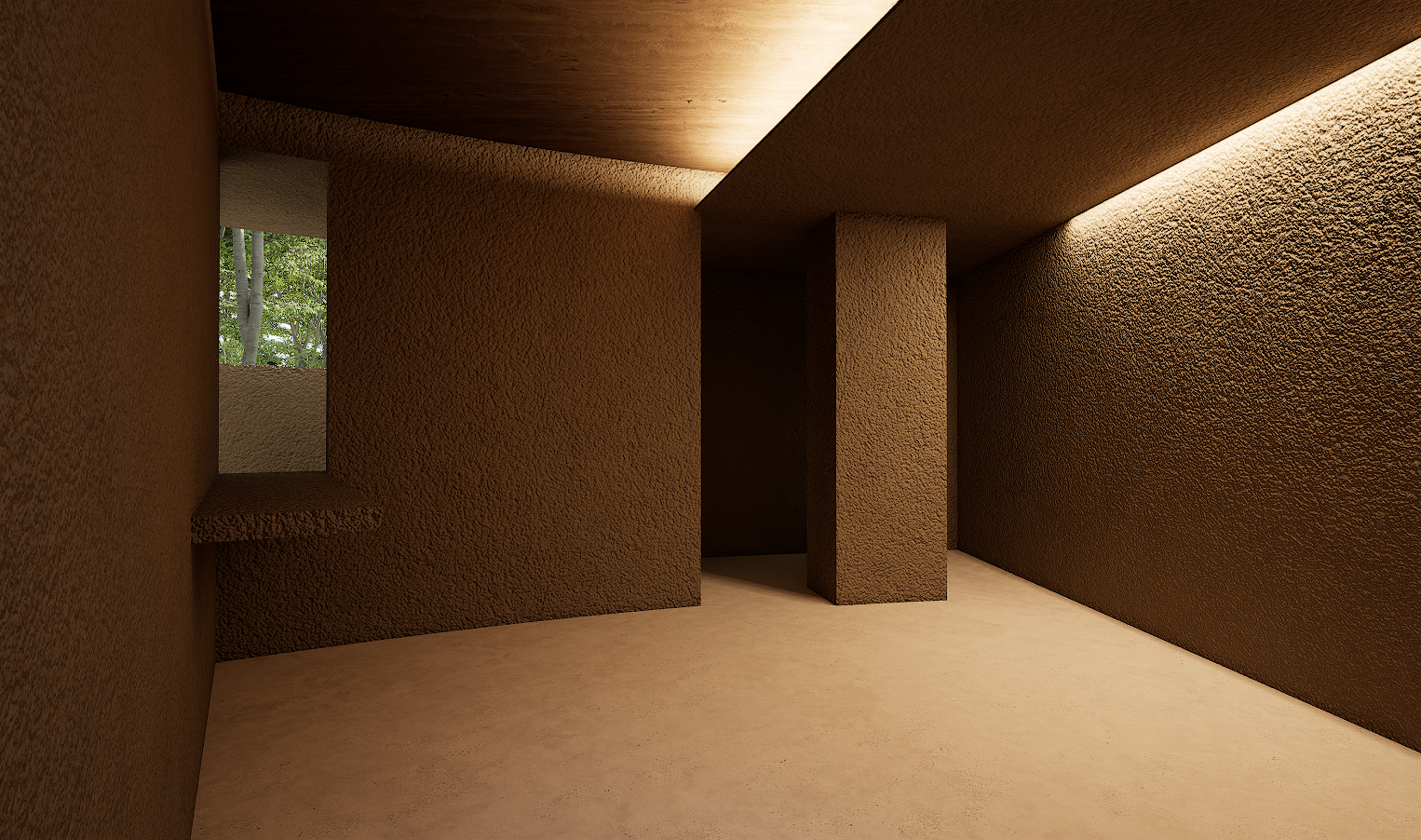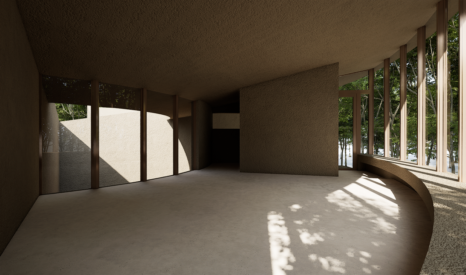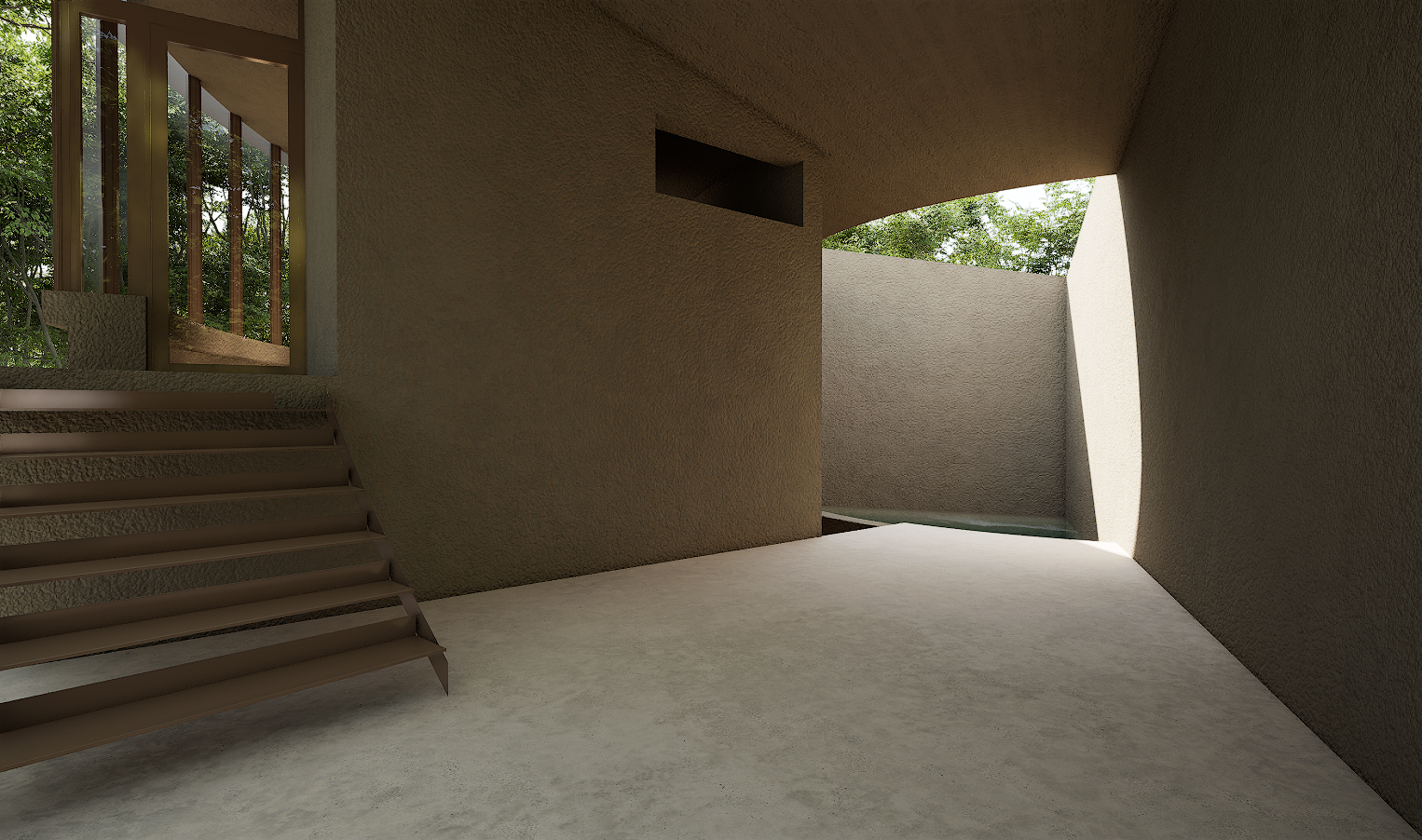 扇形の建物の外側にはフクギ、内側には空に抜けるプールを配置し、どこにいてもフクギと空のAOが感じられ、プライバシーに配慮しつつ、枝葉が風で靡く音や雨音が壁で反響して、ここでしか感じられない五感を刺激する空間となっております。